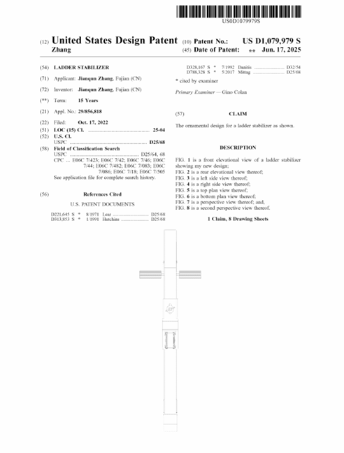 原告Jianqun Zhang,名下有一款梯子稳定器的外观设计专利,其创新点体现在产品的外观造型上,旨在提升梯子使用时的安全性和稳定性,属于梯子配件领域的视觉设计保护。