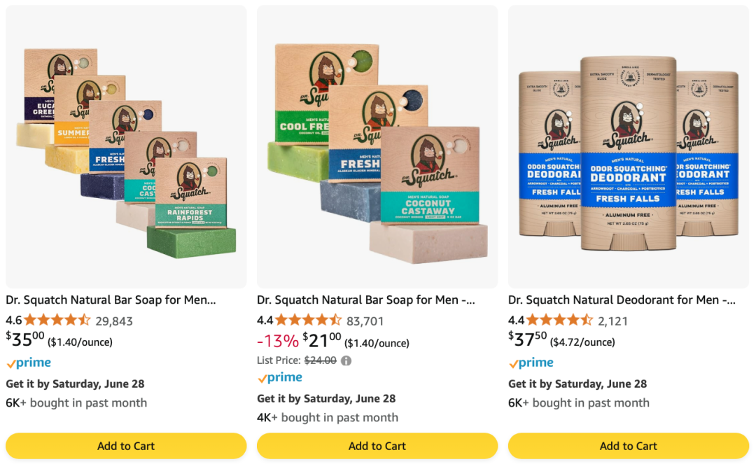 在亚马逊,Dr Squatch是男士个人护理类目的热门品牌,多款单品月销量数千件,评论数量数万个。