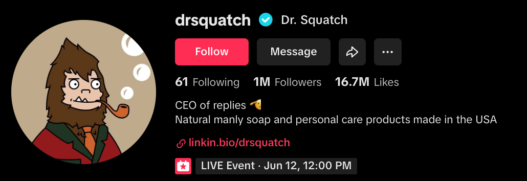Dr Squatch也是抓住TikTok早期红利,大力投入TikTok的美国本土品牌。其官方TikTok账号,粉丝数100万,点赞超过1000万,定期还做直播。