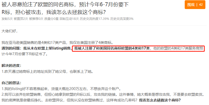 无独有偶,另一位卖家遭遇被人恶意抢注了欧盟的同名4类和17类商标,该卖家仅在美国注册了4类美国商标,从未在欧盟上架listing销售。