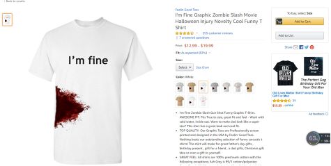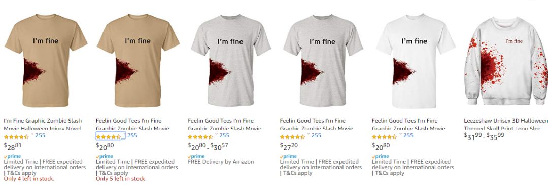 近日eBay上售卖的血迹恶搞T恤遭到英国刀袭案受害者家属的强烈抨击,这件白色T恤上印有红色血迹,看起来像是被刺伤枪伤,并附上了“I'm fine”(我很好)的标语。同时还发现亚马逊、Zazzle、Redbubble和Wish仍在销售类似服装。