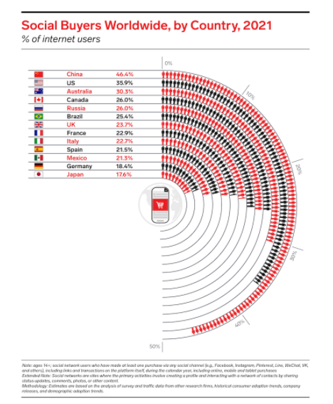 社交商务指直接在社交平台上进行购物,或通过点击社交网络上指向零售商产品页面的链接来完成交易。尽管美国在疫情后已经逐渐开始重新开放,但在封锁期间出现的部分趋势仍将在今年继续存在。尽管美国社交消费者整体上的支出并不多,但他们的平均订单价值(AOV)相对较高。eMarketer预测,到2021年将有9020万美国人(占美国互联网用户的35.9%)在日历年内至少进行一次社交商务购物行为。这也使得美国将在13个社交电商快速发展的国家中排名第二,仅次于中国。从图中可以看出,澳大利亚、加拿大、俄罗斯也有大量社交电商买家。