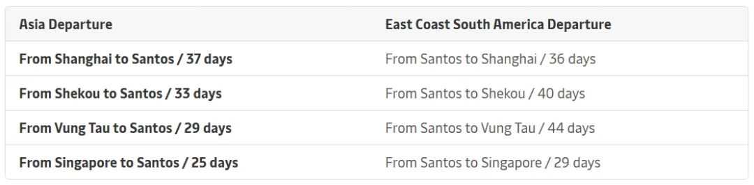 新航线开通后,预计上海至桑托斯共需37天,具体如下: