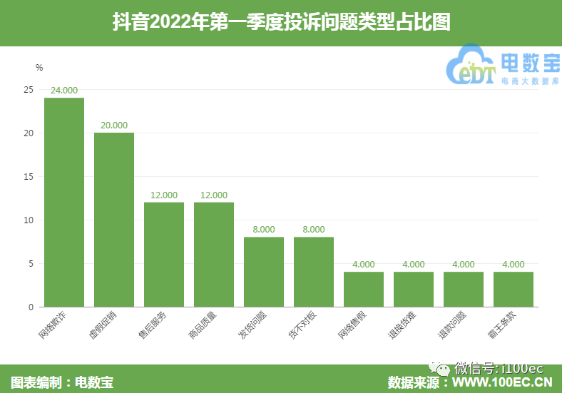 此外,“电诉宝”受理用户维权案例显示,2022年第一季度抖音还涉嫌存在网络欺诈、虚假促销、售后服务、商品质量、发货问题、货不对板、网络售假、退换货难、退款问题、霸王条款等问题。