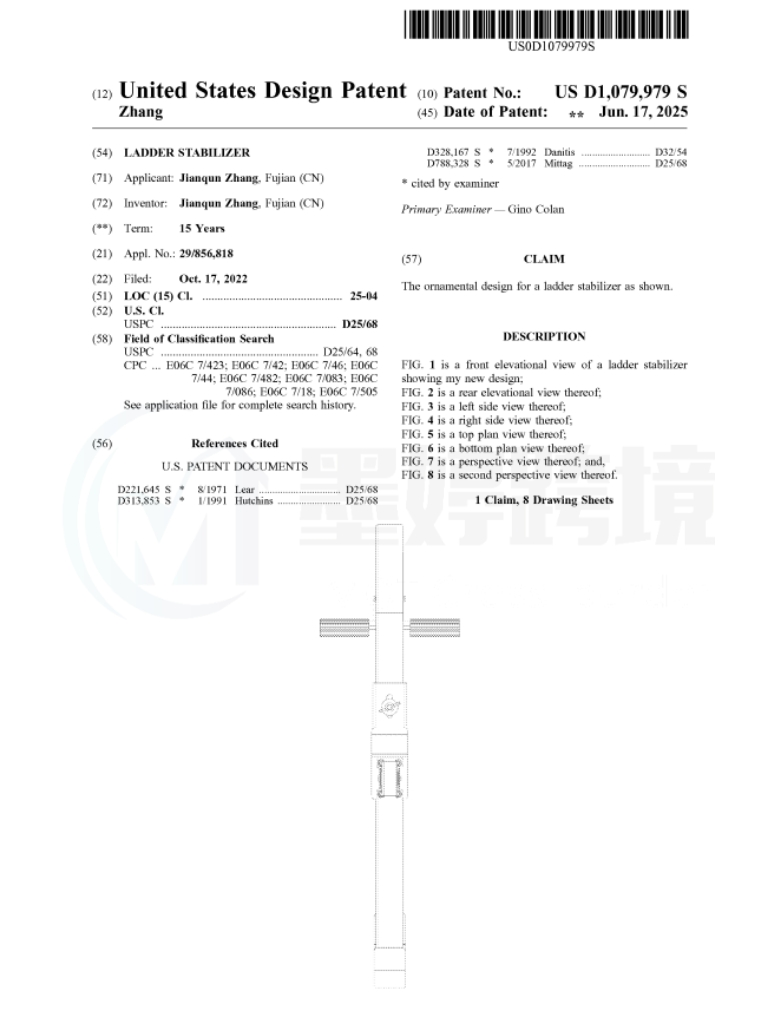 Ladder Stabilizer 梯子稳定器,由中国福建卖家 Jianqun Zhang 拥有外观专利(专利号:USD1079979S)。该专利于2025年6月正式授权,主要保护产品的外观设计,专为增强梯子使用时的安全性和稳定性而开发。它能够在窗户、排水沟、屋顶等位置绕开障碍物,帮助梯子稳固支撑。