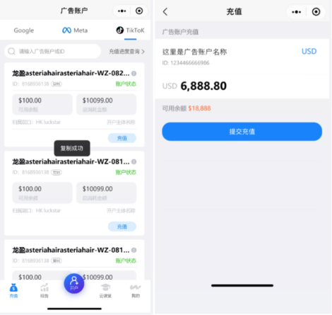 2) 广告账户充值页:一键可复制账户名称,快捷充值