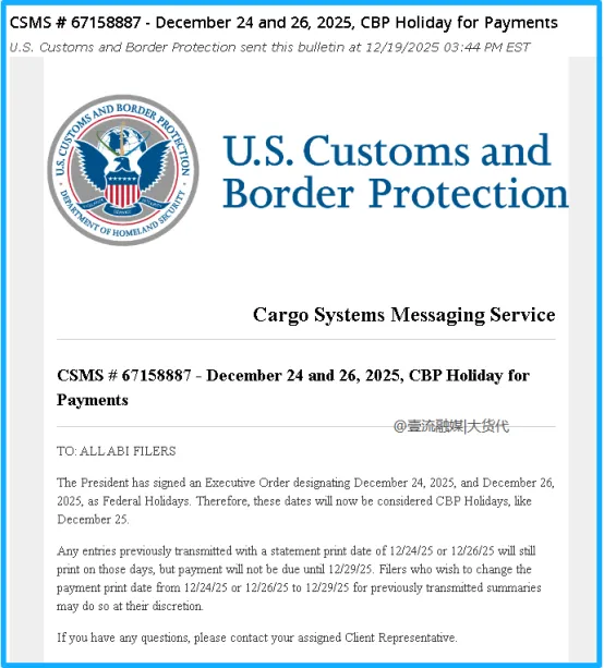 根据美国海关表示,目前,基于此项假期调整,之前提交的报表打印日期为 2025 年 12 月 24 日或 2025 年 12 月 26 日的任何条目仍将按这些日期打印。