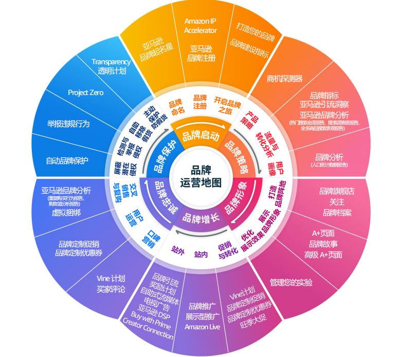 霞光社发现,在卖家品牌建设上,目前亚马逊已经形成了一套系统的品牌运营地图,包括“品牌启动”“品牌策略”“品牌形象”“品牌增长”“品牌忠诚”“品牌保护”等方面。其中在“品牌策略”里,亚马逊可以提供品牌指标、亚马逊引流洞察、亚马逊品牌分析(热门搜索全词报告、搜索词表现报告、全系商品搜索表现报告)等工具,帮助品牌实现流量增长、了解用户定位、洞察用户购买习惯,完成品牌建设。