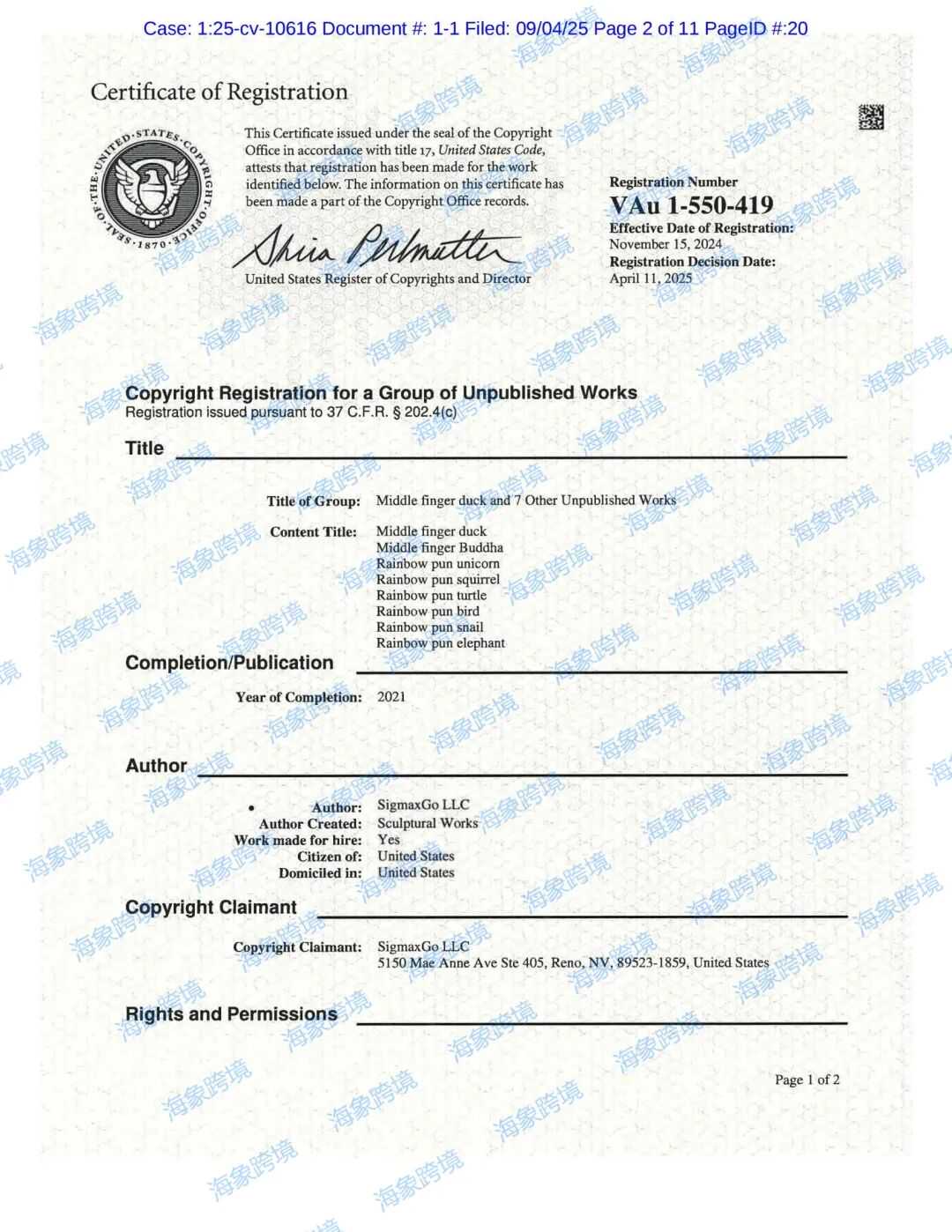 原告SIGMAXGO LLC 是一家内容创作者,为家居用品创作插画。此案涉及多张搞怪装饰物设计图,请相关卖家注意排查避雷!