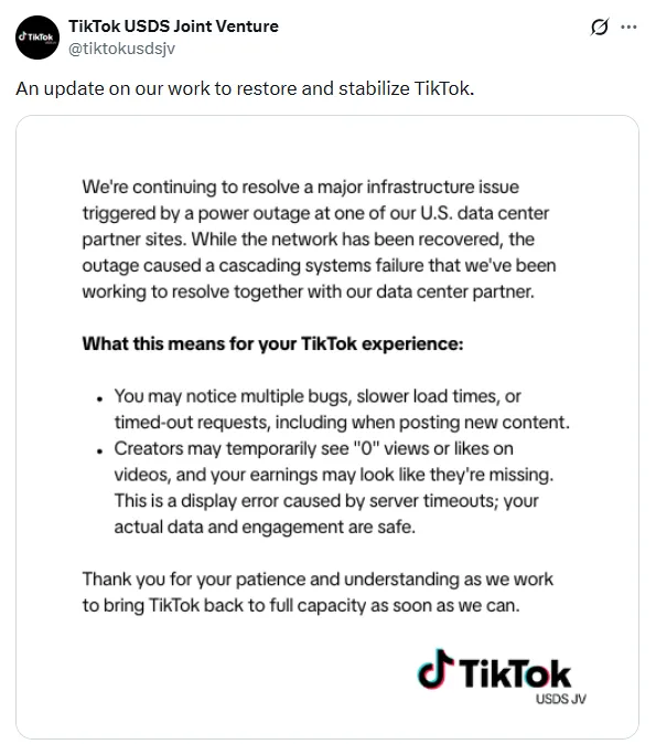 当地时间1月26日,TikTok 美国数据安全合资有限责任公司(简称 TikTok USDS 合资公司)在社交媒体平台布声明,对此次故障情况进行了回应。声明指出,平台正全力解决由美国数据中心合作伙伴站点断电引发的重大基础设施问题。