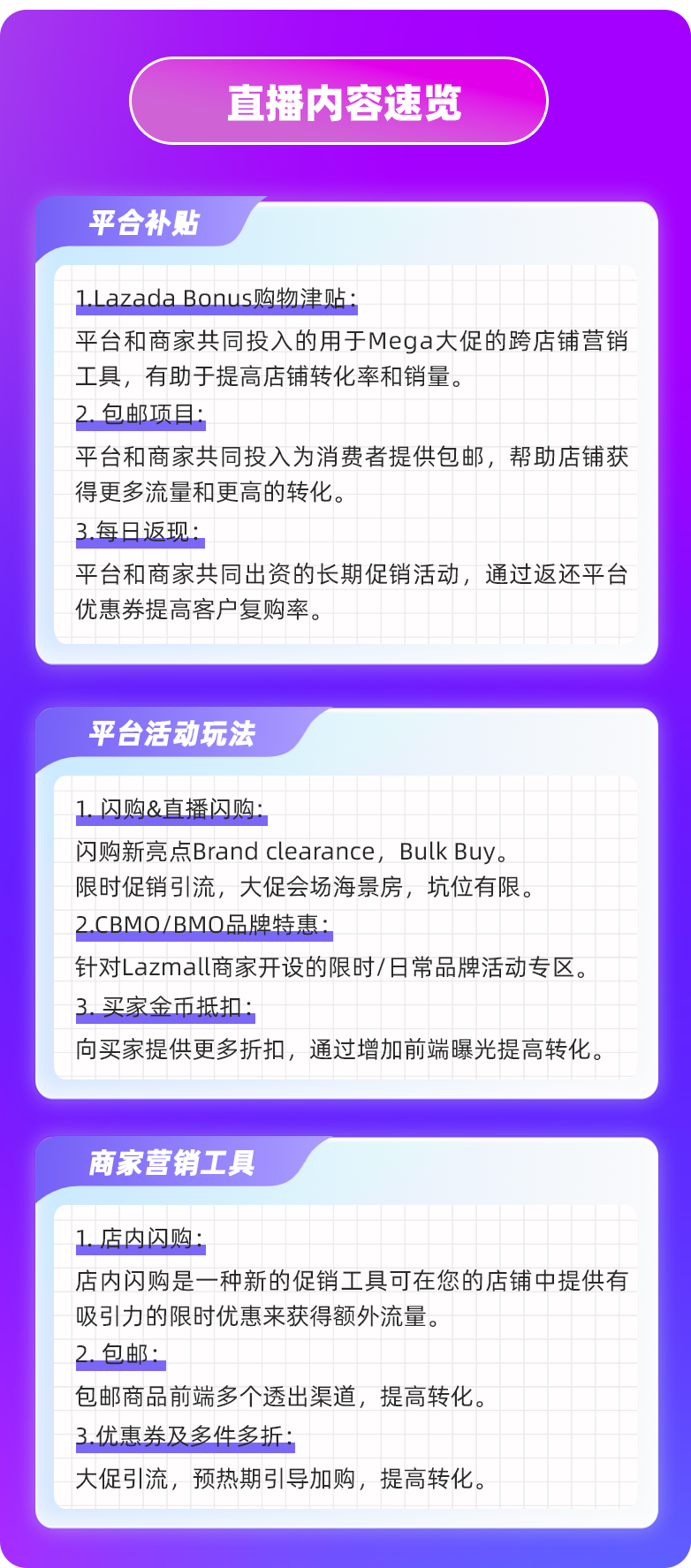 *Lazada全年大促共分为Mega/A+/A/B/C五个等级。其中,Mega级大促作为等级最高,规模最大的促销活动,是Lazada商家最不容错过的实现销量跃迁的绝佳机会。