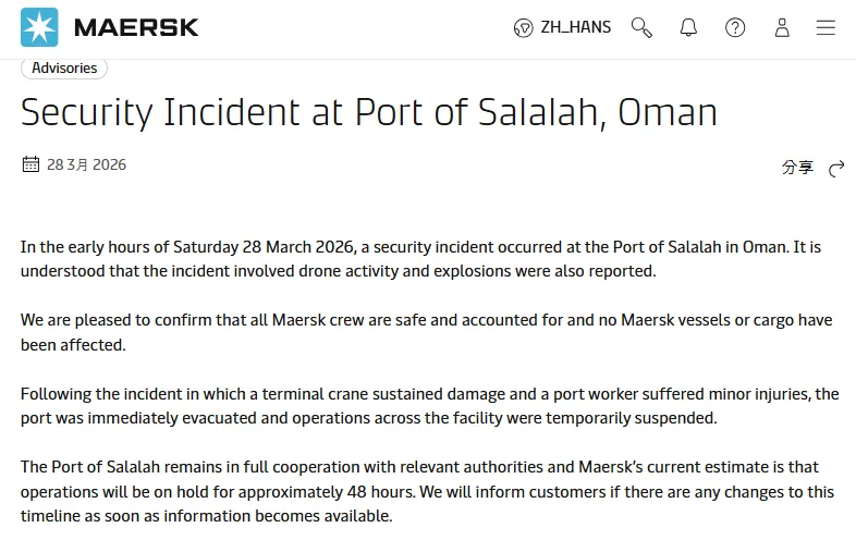 又一关键航运节点遭遇冲击,中东供应链再度承压。当地时间3月28日,阿曼重要枢纽港口塞拉莱港突发无人机袭击,港口设施受损、作业一度全面中断。事件发生后,航运巨头马士基迅速宣布暂停在该港的全部运营作业。随着红海与海湾局势持续升温,港口安全风险正从航道向核心基础设施蔓延,全球航运体系的不确定性进一步加剧。