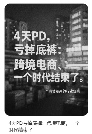 对了,不要和我说什么AI大模型,说什么新能源汽车、机器人这类天天在新闻里听到的高大上产业,这是我等草根能够触碰的创业领域吗?再看跨境电商,不管是打工还是创业,至少还是有一些屌丝逆袭的机会,虽然也已经不多了。