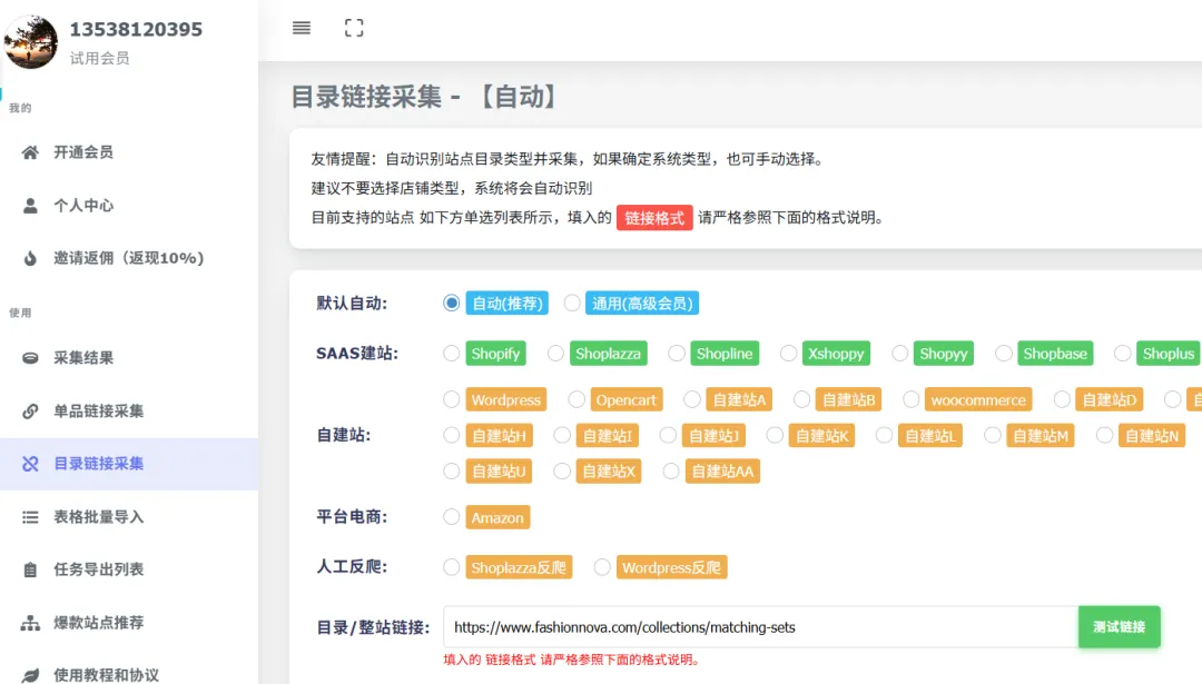 直接把类目链接粘贴进去,一键采集即可,类目采集下来,等于拿到了一套现成的商品框架,非常适合新站冷启动。