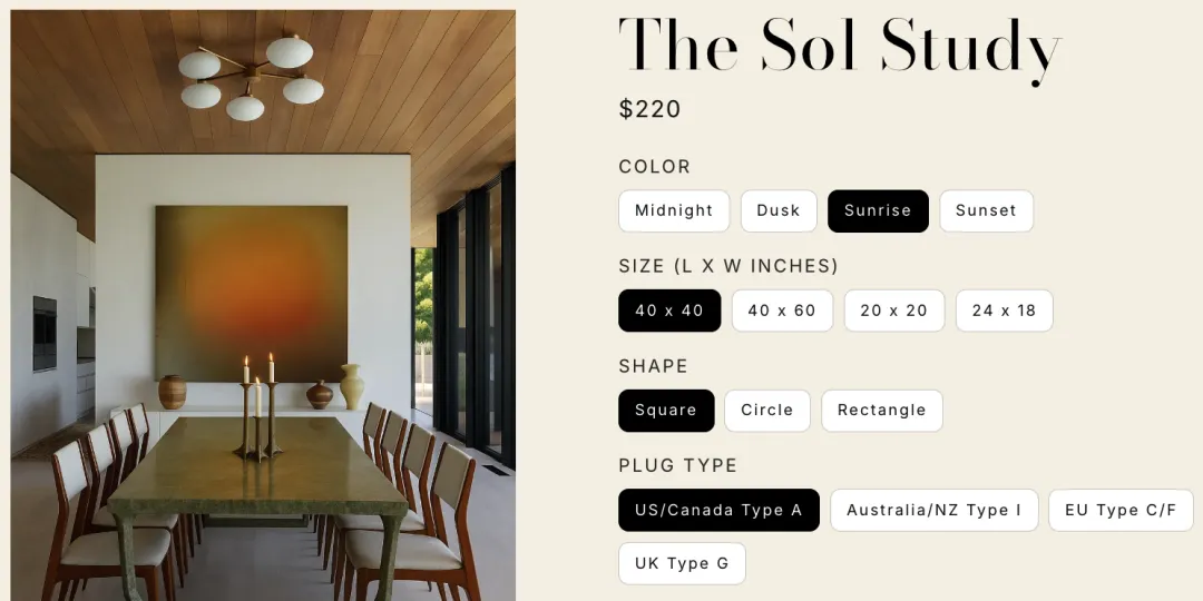 具体来看产品,The Sol Study来自Tyka Pryde独立站,有四个颜色(日出、黄昏、日落和午夜)、4个尺寸——以便能够适应面积大小不一的墙面,以及适配4个不同地区的插头类型供选择,最大尺寸40x60英寸,售价在$200-325。这个定价填补了宜家式快时尚家具(低价、廉价感)与几千美金的顶级设计名品(高门槛)之间的空白。能够吸引到范围更广阔的追求品质与个性、愿意为情绪价值付费的消费者。