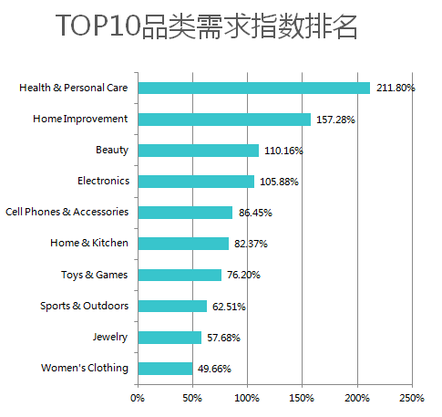 # 品类 需求指数 1 Health & Personal Care 211.80% 2 Home Improvement 157.28% 3 Beauty 110.16%