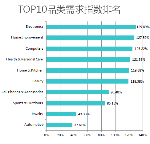 # 品类 需求指数 1 Electronics 2 Home Improvement 127.59% 3 Computers 125.22%
