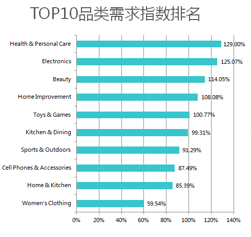 # 品类 需求指数 1 Health & Personal Care 129.00% 2 Electronics 125.07% 3 Beauty 114.05%