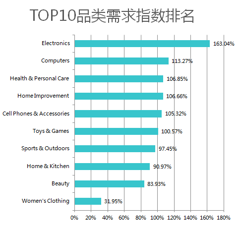 # 品类 需求指数 1 Electronics 163.04% 2 Computers 113.27% 3 Health & Personal Care 106.85%
