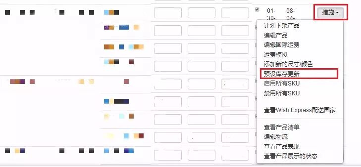 进入想要调整库存的黄钻产品所在的Wish Express海外仓,找到需要调整库存的商品点击产品最右侧的“措施”按钮,并找到“预设库存更新”按钮,点击进入页面。