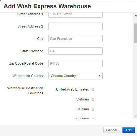 举个例子: 商户在美国有两个实体仓库,分别在洛杉矶和新泽西州,两个仓库的Express配送目的国均为美国。商户的产品SKU-1在洛杉矶仓的库存是100件,在新泽西州仓的库存也是100件。因此,商户需要创建一个“US”Wish Express仓库并设置产品SKU-1的库存为200。通过此操作,商户将在美国的两个实体仓库的库存合并到一个虚拟仓库中。