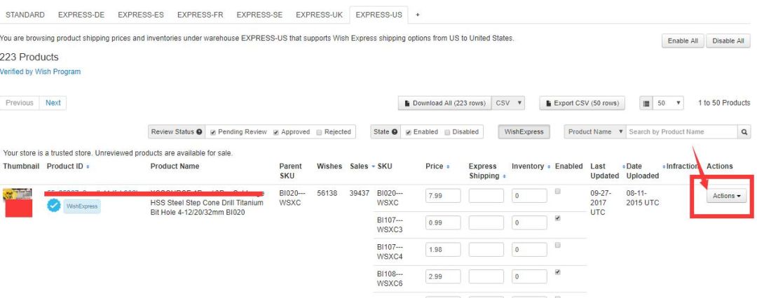 进入相应仓位,找到想要重新加入海外仓项目的产品,点击“Actions”(产品措施)。