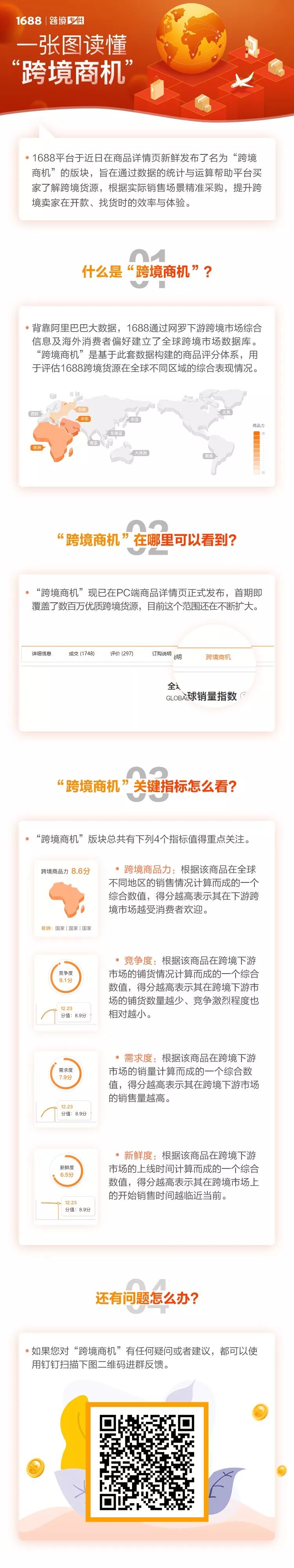跨境商机不仅影响商家得分,同时会在PC端商品详情页面展示,反映商品的商品力、需求度、新鲜度、竞争度四个维度的能力,商家可以快速了解自己的商品中哪些受市场青睐,哪些潜力高,哪些会在不久的将来爆发,可以帮助商家更好地为商品匹配关注度和资源。