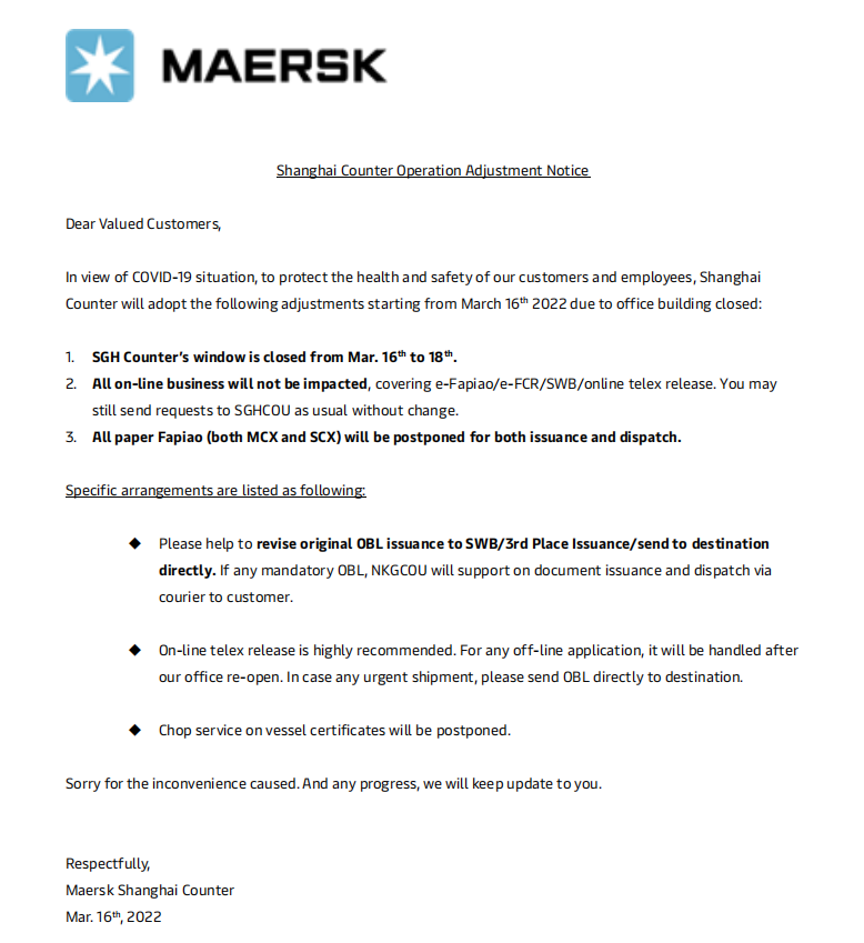 3月16日,马士基发布公告表示,因疫情防控政策要求,其上海柜台业务即日起进行以下调整: