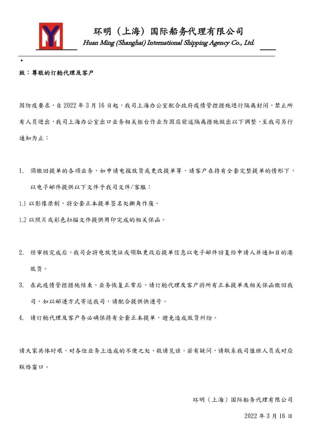 阳明海运中国区/环明(上海)国际船务代理有限公司今日也表示,即日起,出口业务相关柜台作业,做出以下调整: