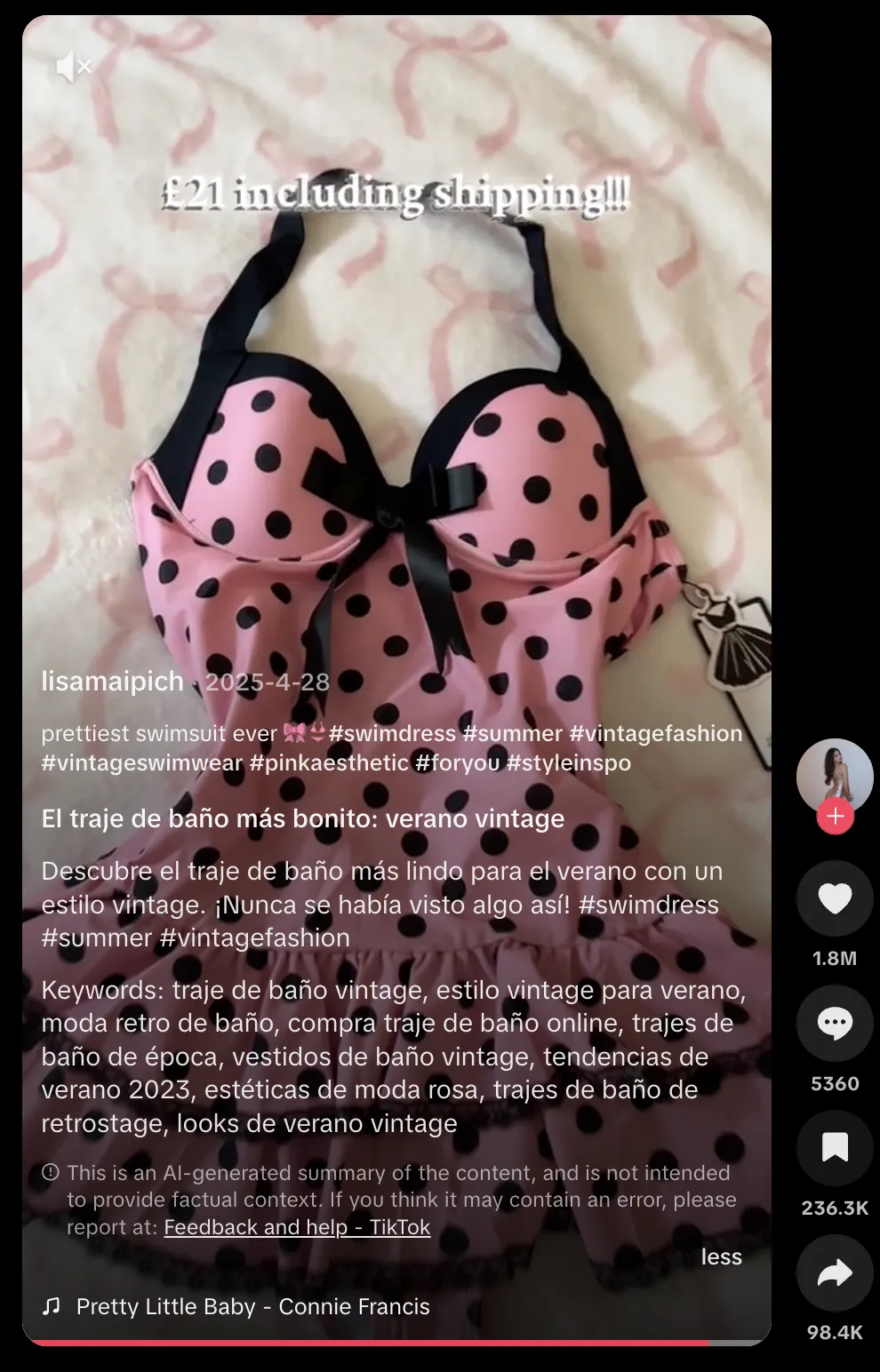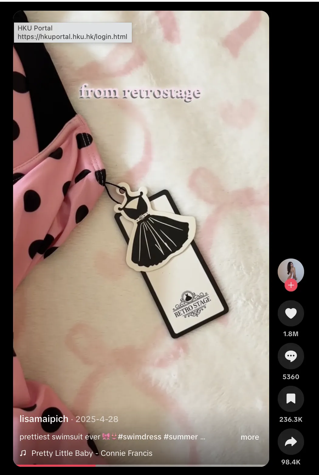 在与 Retro Stage 的深度共创中,Lisa Mai 通过 TikTok 发布了一段现象级的视频,展示品牌标志性的粉色波点复古泳衣。