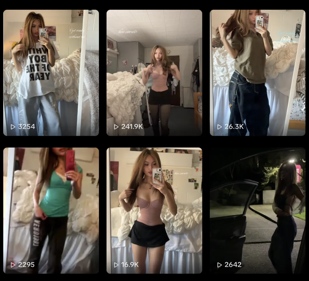 与那种高不可攀的名媛风格不同,Charmayne 常在宿舍或私人寝室背景下,通过镜面自拍展示她的穿搭。这种“接地气”的拍摄方式配合她轻性感且充满活力的视觉形象,让她的内容具有极高的可模仿性。