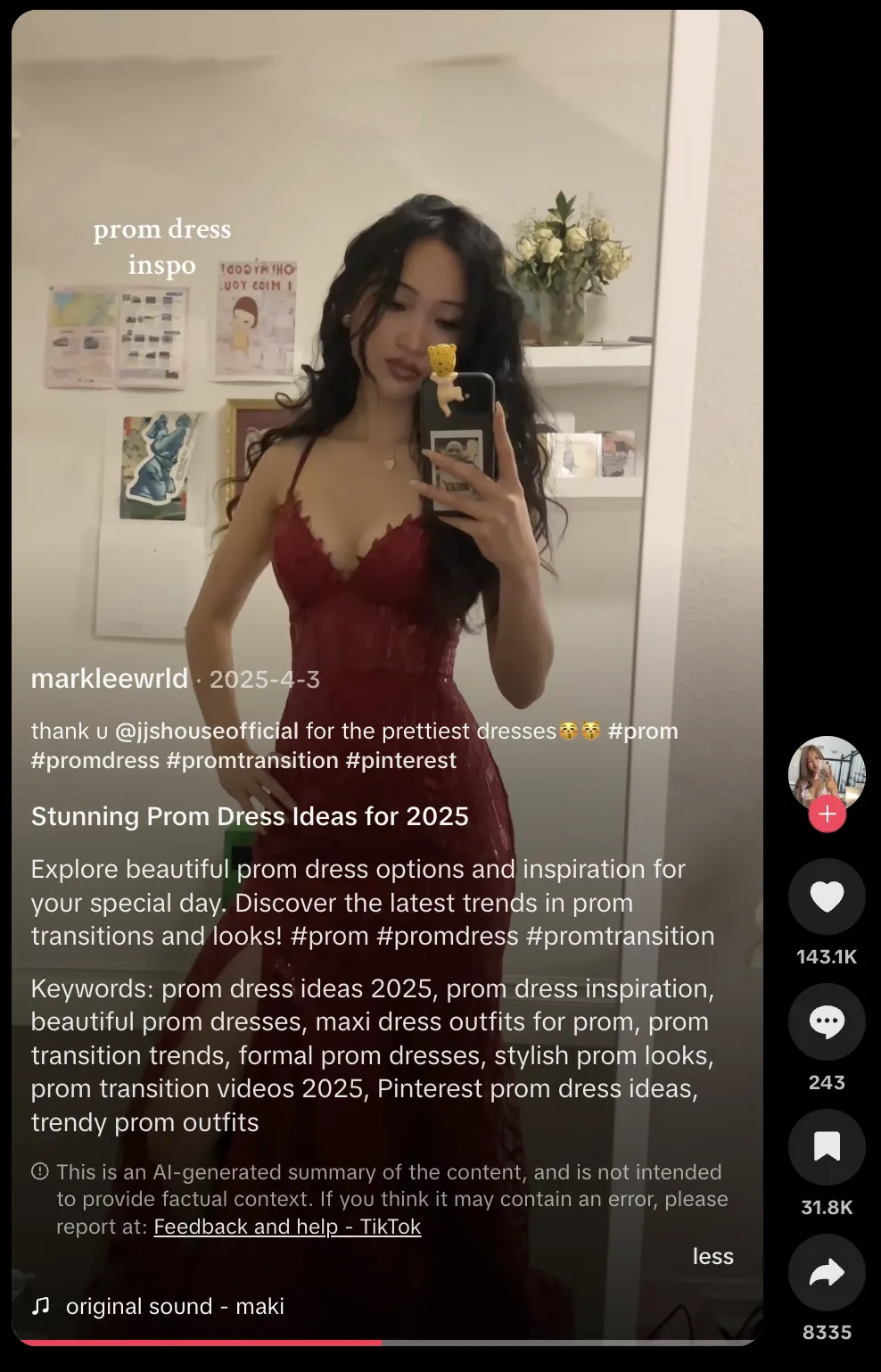 Charmayne 在文案中直接标注并感谢了品牌官方账号 @jjshouseofficial,并精准使用了 #prom、#promdress 等垂类标签,确保内容能被正在备考和准备舞会的精准受众搜索到。