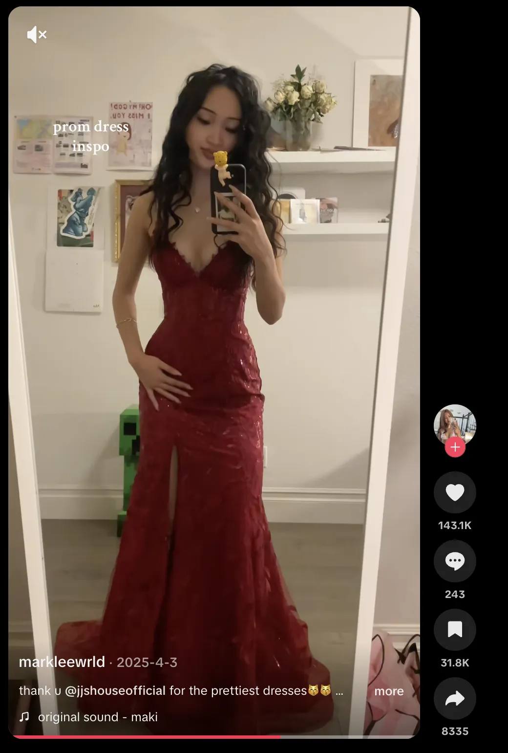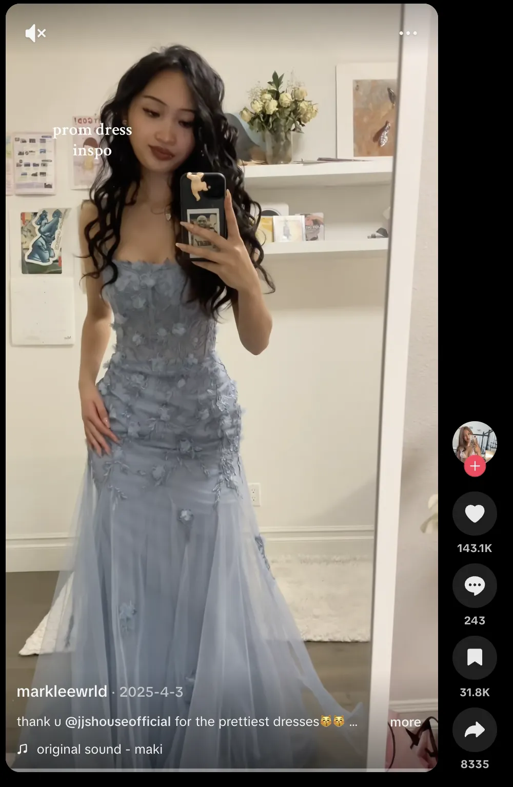 她擅长利用 Y2K、复古元素以及强调身材线条的剪裁来吸引受众,尤其是那些正在寻找校园舞会灵感的青少年和 20 岁出头的年轻女性,这也使得她成为礼服品牌合作的理想人选。
