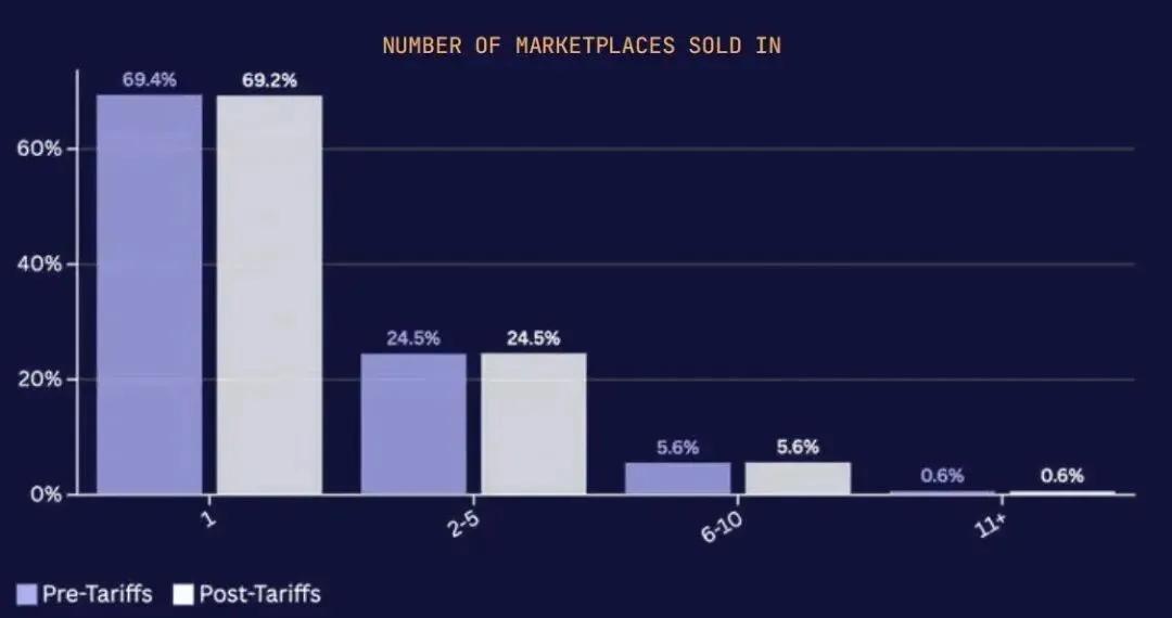 卖家对扩张保持谨慎,主要原因是税务、关税和运营成本较高。跨国销售需要投入翻译、包装、海外仓储和物流费用,一旦失败,损失较大。因此,大部分卖家选择集中在本土市场。