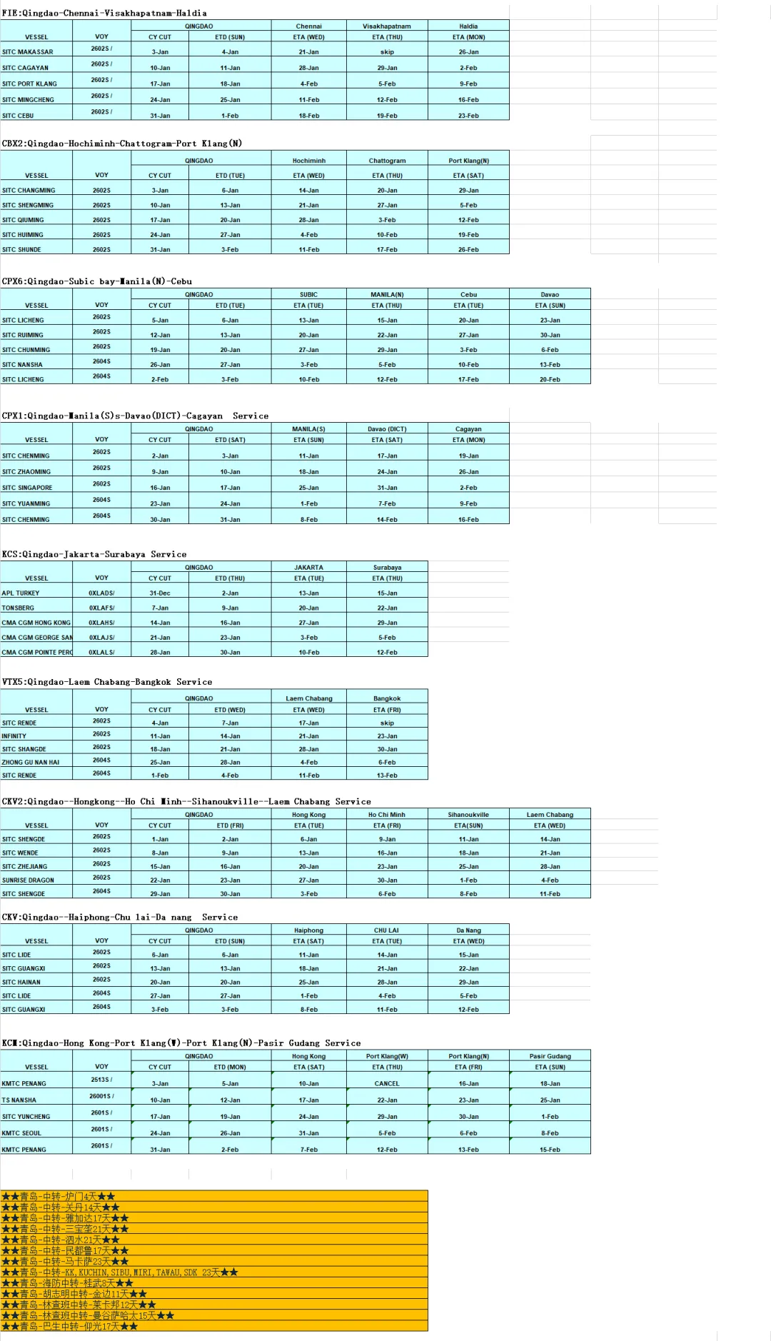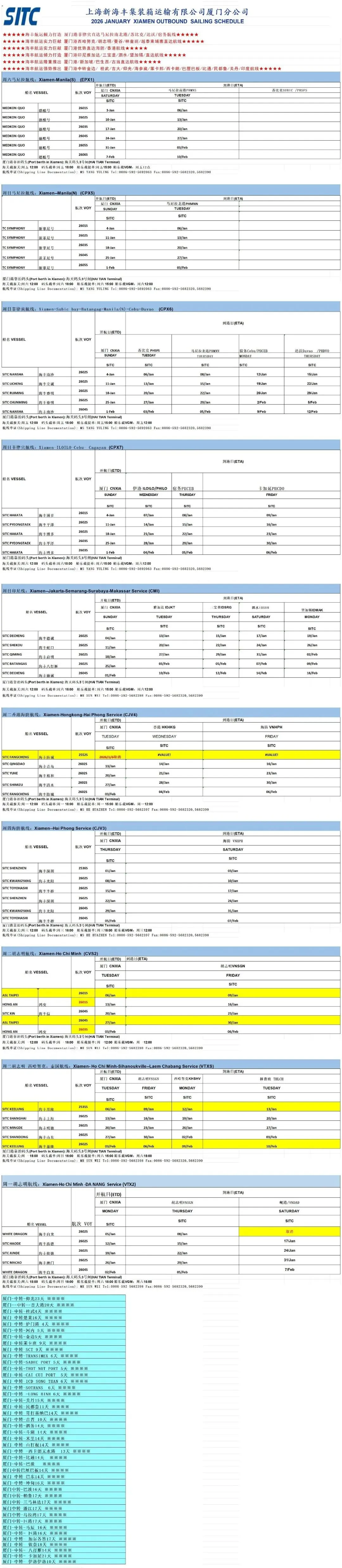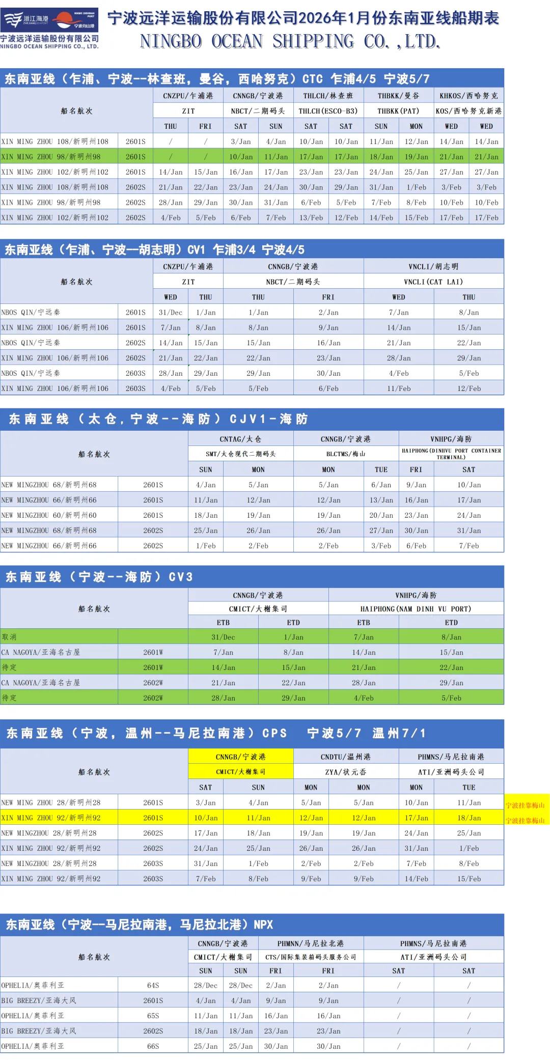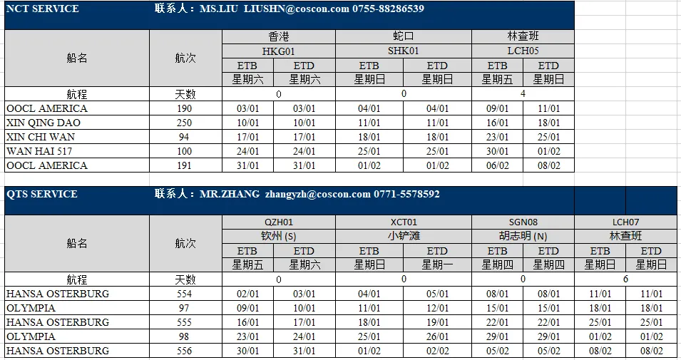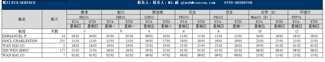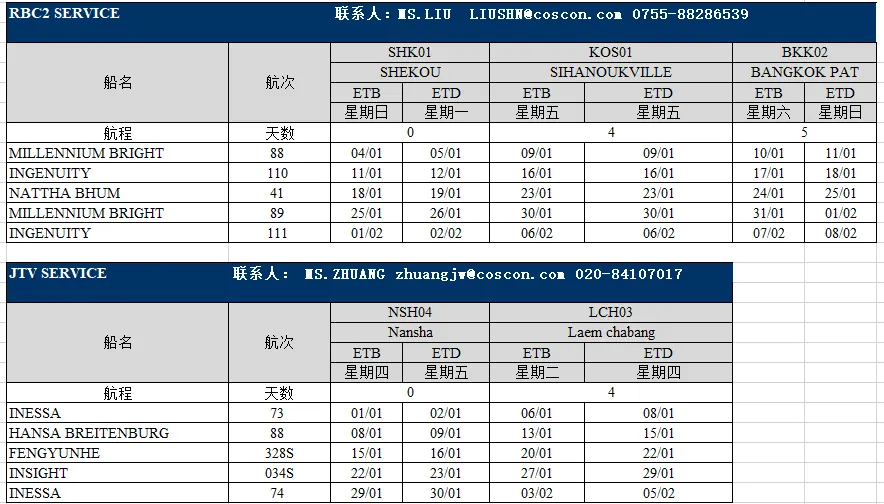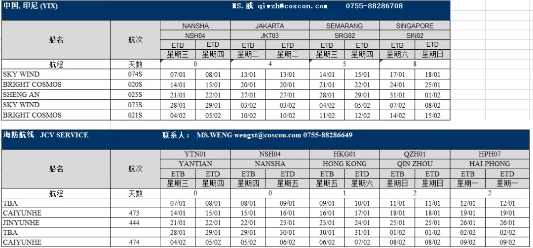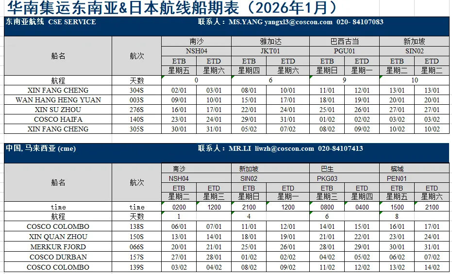 东南亚部分航线1月船期表出炉;