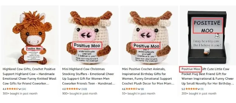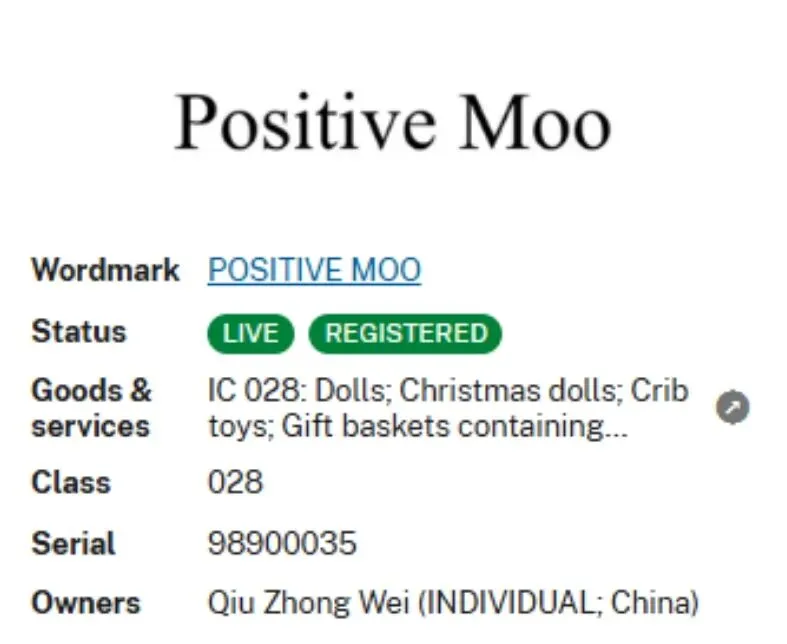 涉案商标 “Positive Moo” 已核准注册在第 28 类,品类覆盖玩偶、毛绒玩具、布娃娃、填充玩具、宠物玩具等,对应商标号 7905928。目前亚马逊前台多款针织玩偶产品的相关页面中已出现该词汇,涉及 listing 详情、产品标题及产品图片等多个场景,侵权隐患极高。