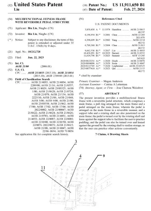 涉案产品为健身器械,专利为Multifunctional fitness frame with reversible pedal structure,只要有有类似原理或结构均有侵权风险,无论外观是否相同,专利号US11911650B1,2023年6月22日申请,2024年2月27日下证。