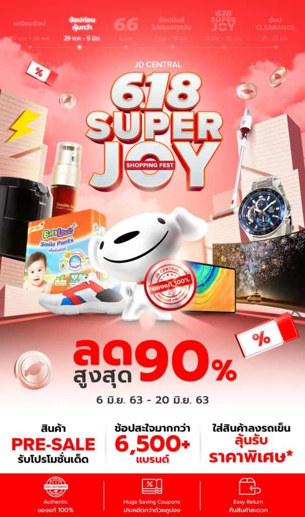 京东还将中国“6·18”模式复制向全球市场。5月30日,京东泰国合资电商平台JD Central(JDC)宣布正式启动“JD Central 618 Super Joy购物节”,首阶段以预热销售为主,覆盖6,500多个品牌商品;后续更是推出超级限时抢购等特色玩法,为中国品牌搭建认知升级的营销场景。