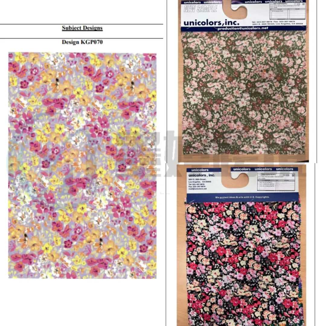 需要注意的是,Unicolors 的印花图案均受到版权保护。近年来,该公司在跨境电商平台上积极维权,如果卖家在选品过程中涉及布料、服饰或带有印花的产品,应当格外小心侵权风险。