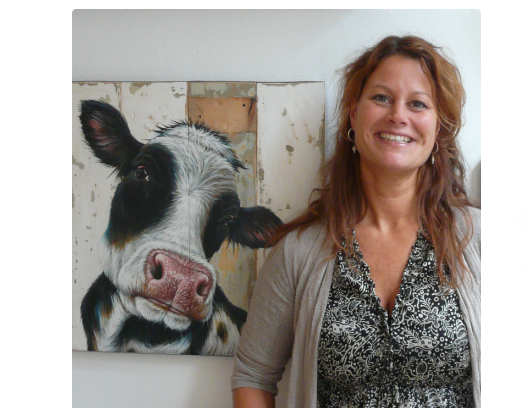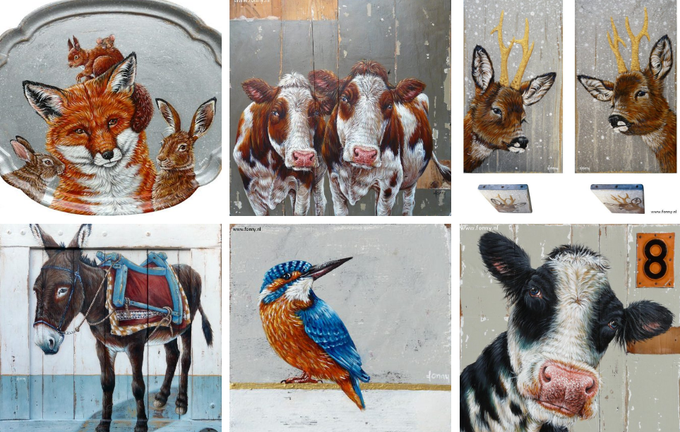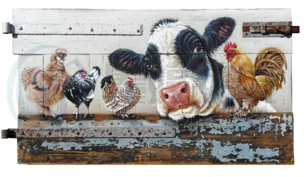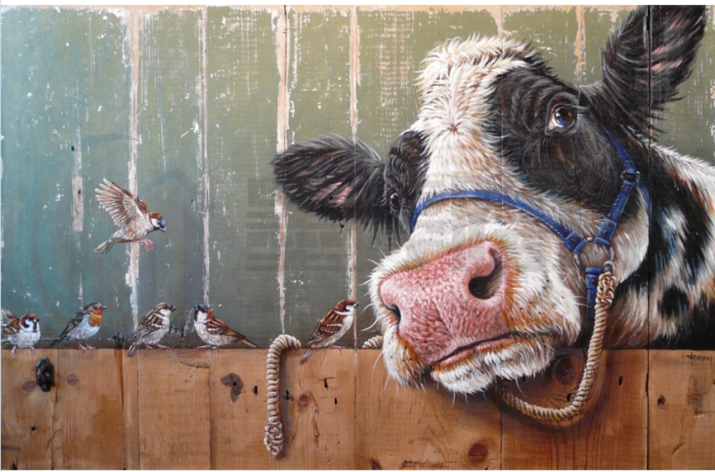 Fonny van der Veen 是来自荷兰的艺术家,她喜欢在旧木板上作画。裂纹、节疤、钉孔,这些原本看似瑕疵的痕迹,在她的笔下反而成了动物表情的一部分。她笔下的猫头鹰、牛、狗等动物,不仅有质感,还带着点幽默、拟人化的神态,看起来既亲切又独特。这种“木纹与动物结合”的风格很容易被人一眼认出。