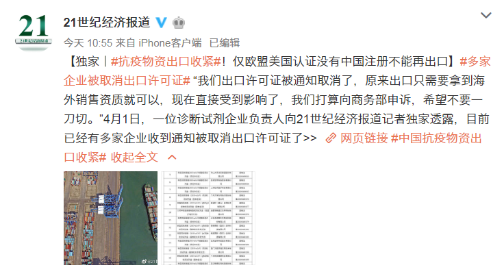 此外,4月1日开始,抗疫物资出口收紧,仅有欧盟美国认证而没有中国注册的抗疫物资不能再出口!