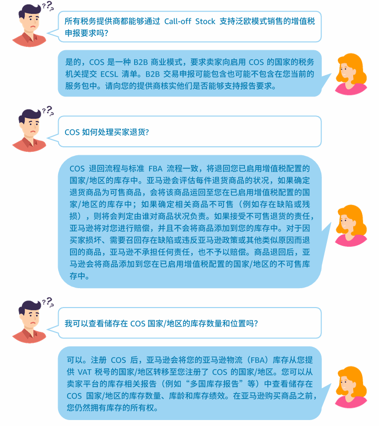 卖家可以访问卖家平台了解如何提交 EC 销售列表的详细信息。亚马逊会提供卖家 B2B 跨境销售和跨境库存的移动清单。请卖家联络其税务顾问来了解具体的针对欧盟 COS 法规,以及增值税(VAT)税号所在国家(德/法/意/西)的税务申报要求。