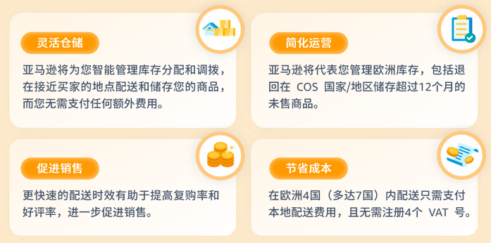 泛欧库存加速器(Call-Off stock,简称为COS)是简化了您加入/使用亚马逊物流欧洲整合服务的项目。卖家仅需在德/法/意/西拥有任意1个增值税(VAT)税号,即可为其他国家/站点开启本地仓储选项,而无需注册 VAT 税号!并以此加入 Pan-EU!
