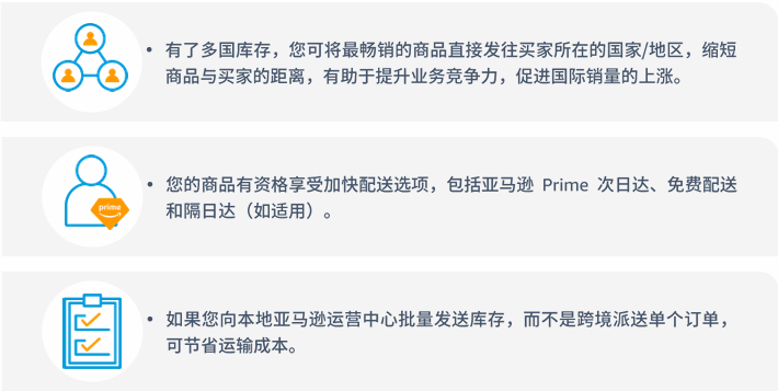 卖家在欧洲注册开通亚马逊物流后,可设置选择多个库存仓储国家,然后直接将库存分别运输至您选择的库存仓储国家,在您储存库存的国家/地区,您的商品可快速配送给当地买家。