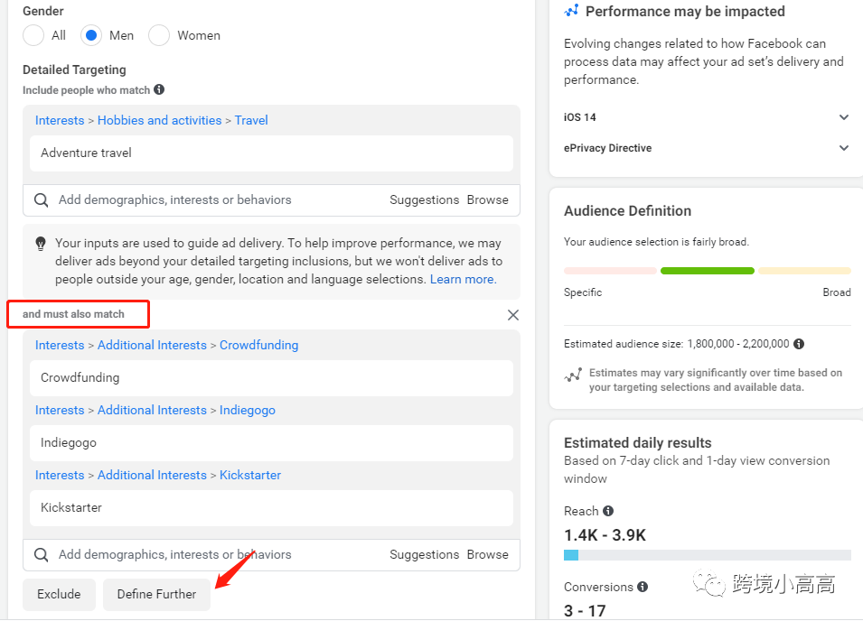 Facebook Ad: 这个绝对是广告投放 的大头了,大部分的投放预算也是在这个平台。因为众筹是属于首发预售的类型,产品通常还具备一定的特点,所以Facebook 首选是对的,广告以 Conversion 为主。好了,但这里有个注意的点,那就是你在选择 兴趣词的 时候,除了选择你的主要兴趣之外,一定要把你的Audience 也同时满足Kickstarter, Indiegogo,Crowdfunding 这些词。上篇文章我讲过了,有些用户是不喜欢在KS平台下单的,但有些用户依然是接受的,所以在选词的时候切记要同时满足这些兴趣,其次就是做好 再营销的工作,最后就是广告素材,非常非常重要,我之前也写过一篇广告投放的小技巧,品牌出海Facebook 广告投放小指南。