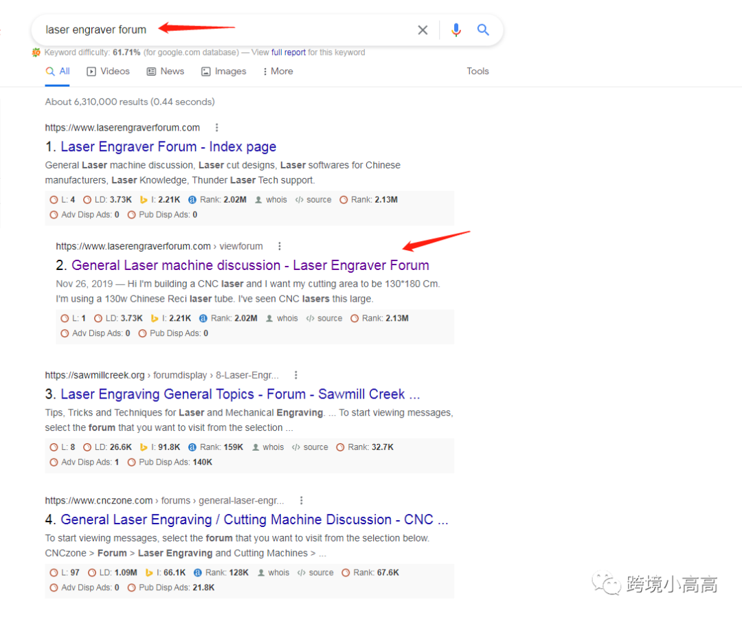 有些行业有自己的垂直论坛,里面的流量不算大,但精准,你所需要的就是找到那个论坛,然后在里面进行发帖推广。比如我是卖激光镭射的,那我直接在谷歌上输入 Laser engraver forum, 那么它就会跳出一些论坛出来,你进去可以找到版主进行商讨合作,给点小钱发帖之类的。