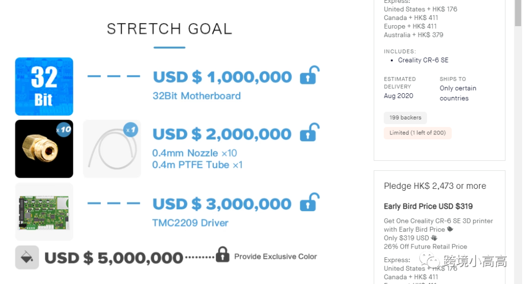 以下面3D打印机举例:该项目达到100万美金的时候,主板将会从8位升级到32位,达到200万美金的时候,在第一个奖励基础上,再额外赠送10个小喷嘴,1个铁氟龙管,如果达到300万美金,在前面2个的奖励基础上,再额外把驱动芯片升级到TMC2209。简单来讲,因为拓展奖励的目标对象是所有支持者,相当于所有人都受益,在某种意义上会刺激一部分的人去帮项目做推广。当然了,这个措施成本会增加,所以大家一定要核对好 成本。