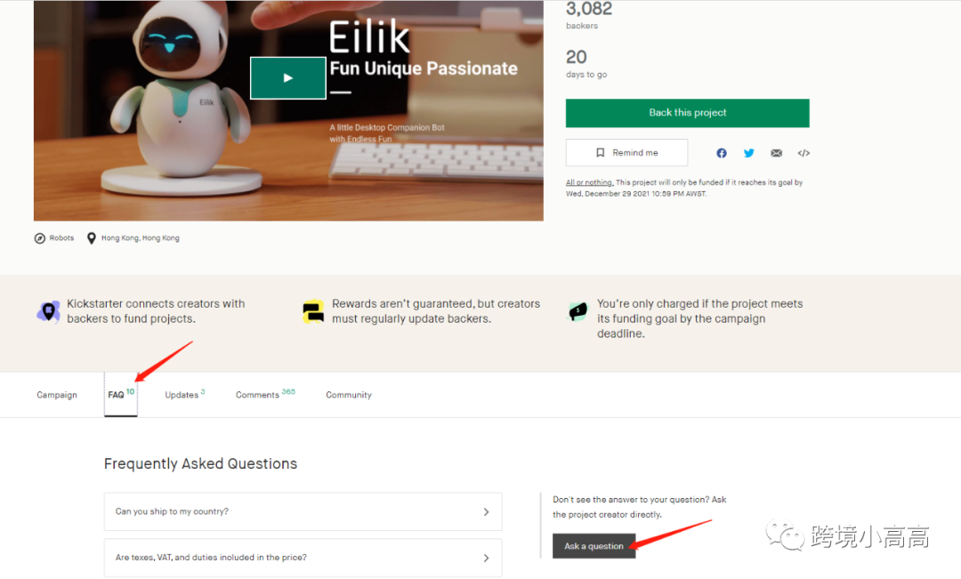 简单来讲,就是互推了,打个比方:你是卖激光雕刻的,然后其中一个品牌方是卖3D打印机的,双方不属于竞争关系,但本质上受众都属于 海外创客,都是喜欢DIY的人群,那这个时候,你完全是可以和对方达成一个协议,在双方的Update 里面都各自推广对方的项目。那具体怎么触及对方呢,很简单,直接在FAQ栏目里面,然后点Ask a Question里面就可以直接和对方留言了。