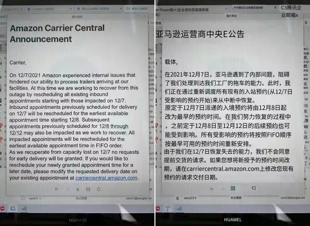 在2021年12月7日,亚马逊遇到了内部问题,阻碍了处理拖车的能力12月8日至12月12日的后续预约也可能受到影响。