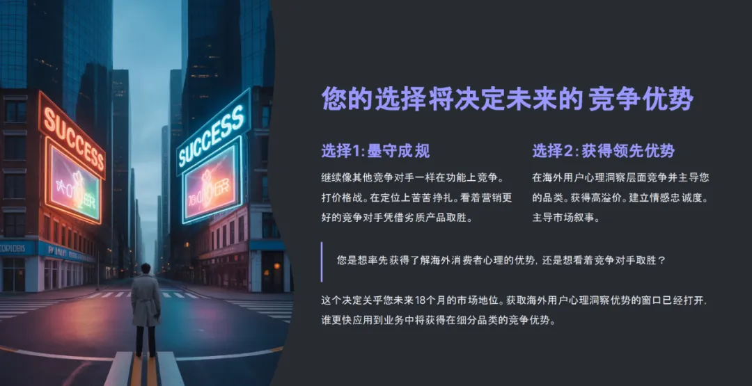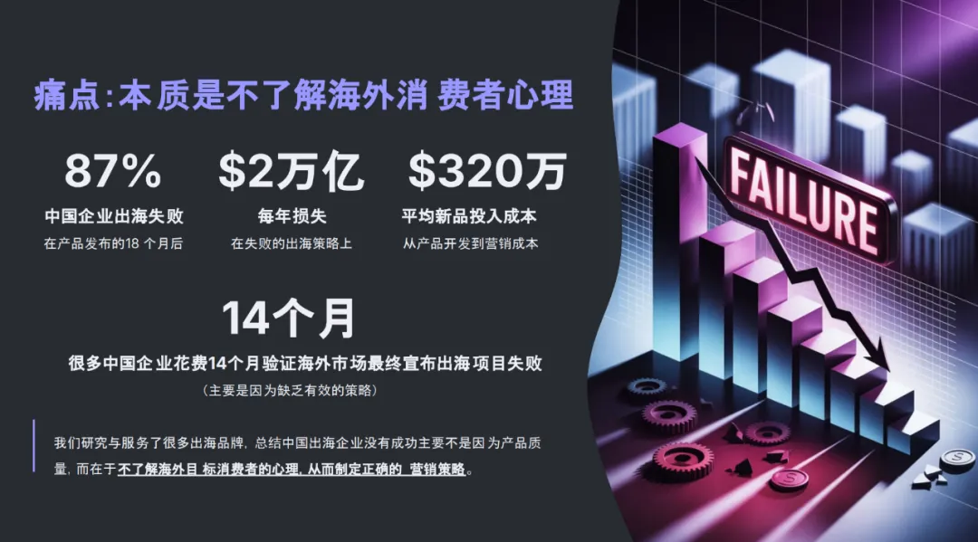我们研究了很多出海品牌,在传统模式下,一个出海品牌从定位到验证平均要14个月,87%中国企业失败的根本原因是不够了解海外用户的心理,浪费了极大的金钱和时间成本。心理洞察路线图可以大大缩短从洞察到验证完成的时间,这能节约了数十万美元的试错成本,更重要的是,抢占了用户心智先机。可以说“未来的竞争,不是产品谁先上市,而是谁先占领用户心理”!